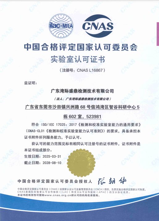 廣東灣際盛鼎檢測技術有限公司公告:2022年8月11日獲得中國合格評定國家認可委員會(CNAS)頒發的實驗室認可證書,截止目前為止,盛鼎防爆實驗室已獲得CMA和CNAS全部資質認可證書。