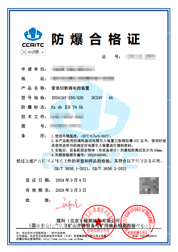 緊急切斷閥電控裝置防爆合格證
