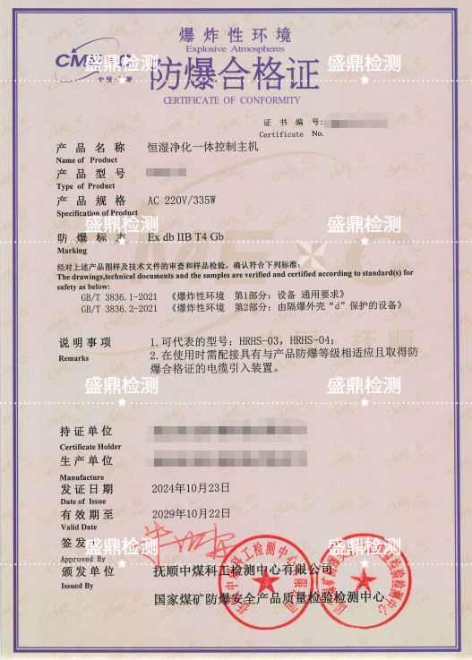 恒濕凈化一體控制主機防爆合格證