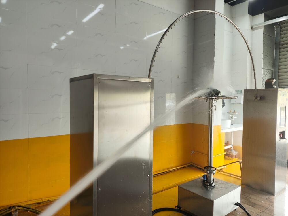 - IPX9:和9k表示對高溫、高壓噴水的防護,對于小型外殼(最大尺寸不超過250mm),樣品安裝在試驗箱內的支撐臺上,轉速(5±1)r/min,噴射角度為0°、30°、60°、90°,每個位置的試驗時間為30s。對于大型外殼(最大尺寸超過250mm),樣品按照預期使用的方式安裝,保證外殼的全部外表面都會被噴射,樣品到噴嘴的距離為(175±25)mm,試驗時間為1min/m2,噴水水溫(80±5)℃,水量為(15±1)L/min,要求對外殼各方向噴高溫高壓水無有害影響。