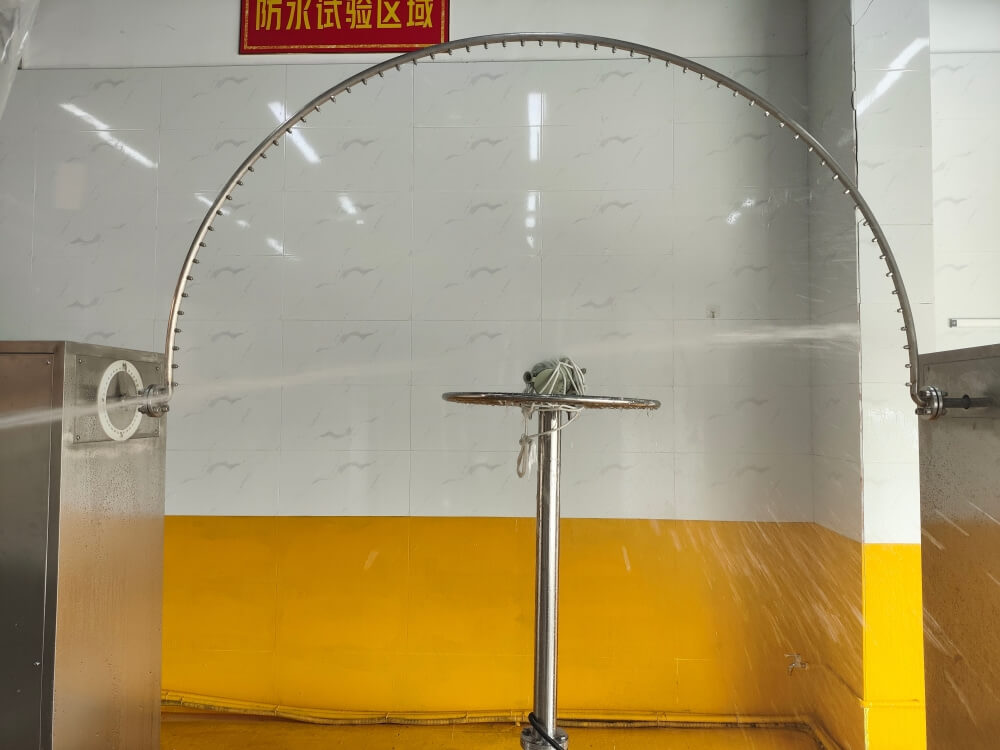 - IPX6:表示對強烈噴水的防護,試驗使用內徑12.5mm的噴嘴,水量為(100±5)L/min,被試樣品外殼到噴嘴2.5m~3m,試驗時間為1min/m2,總時間最少3min,要求對外殼各方向噴水無有害影響。